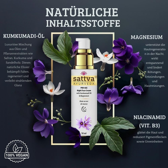 Dzięki połączeniu działania magnezu, niacynamidu i ajurwedyjskiego olejku kumkumadi, zapewnia kojącą i regenerującą pielęgnację na noc. Działa relaksująco na skórę, przywraca blask, redukuje zaczerwienienia, niedoskonałości. Rozkoszuj się bogatą tradycją ajurwedy i obudź się z świeżą, promienną i pięknie odświeżoną cerą.